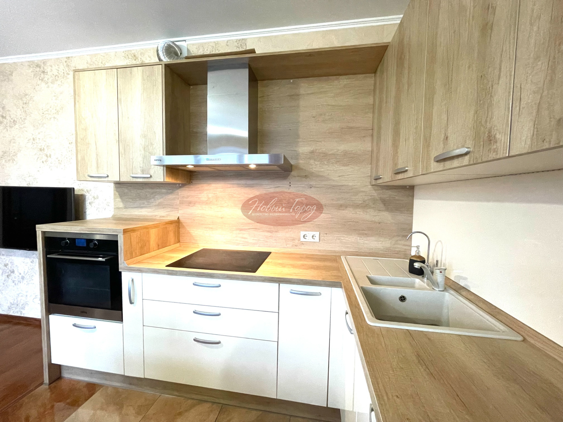 Современный кухонный гаринитур оборудован бытовой техникой: духовка, вытяжка, сенсорная варочая панель,