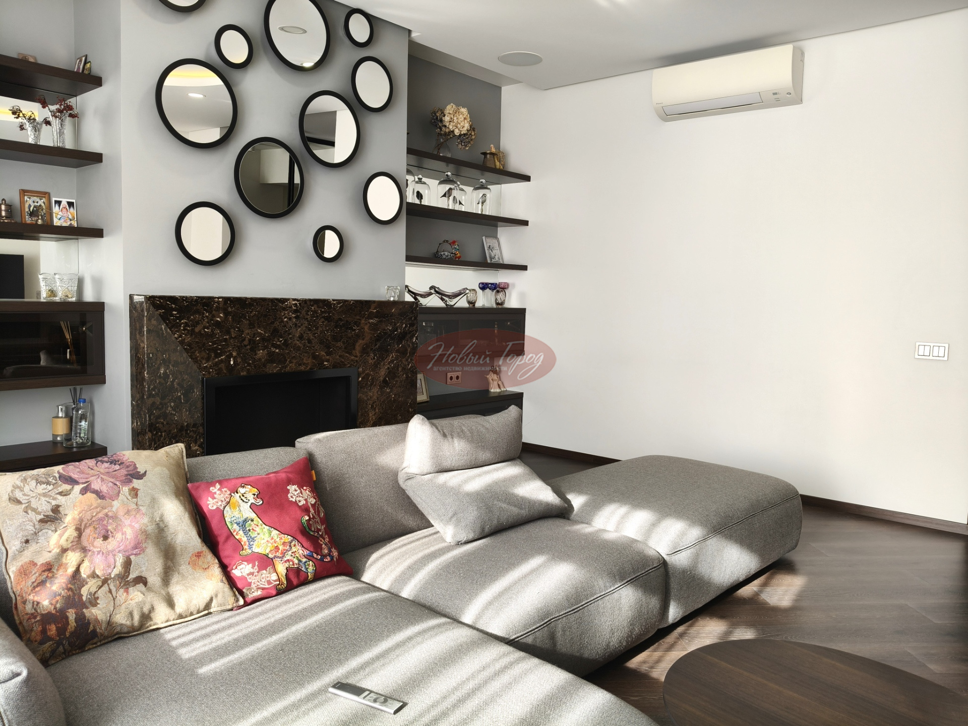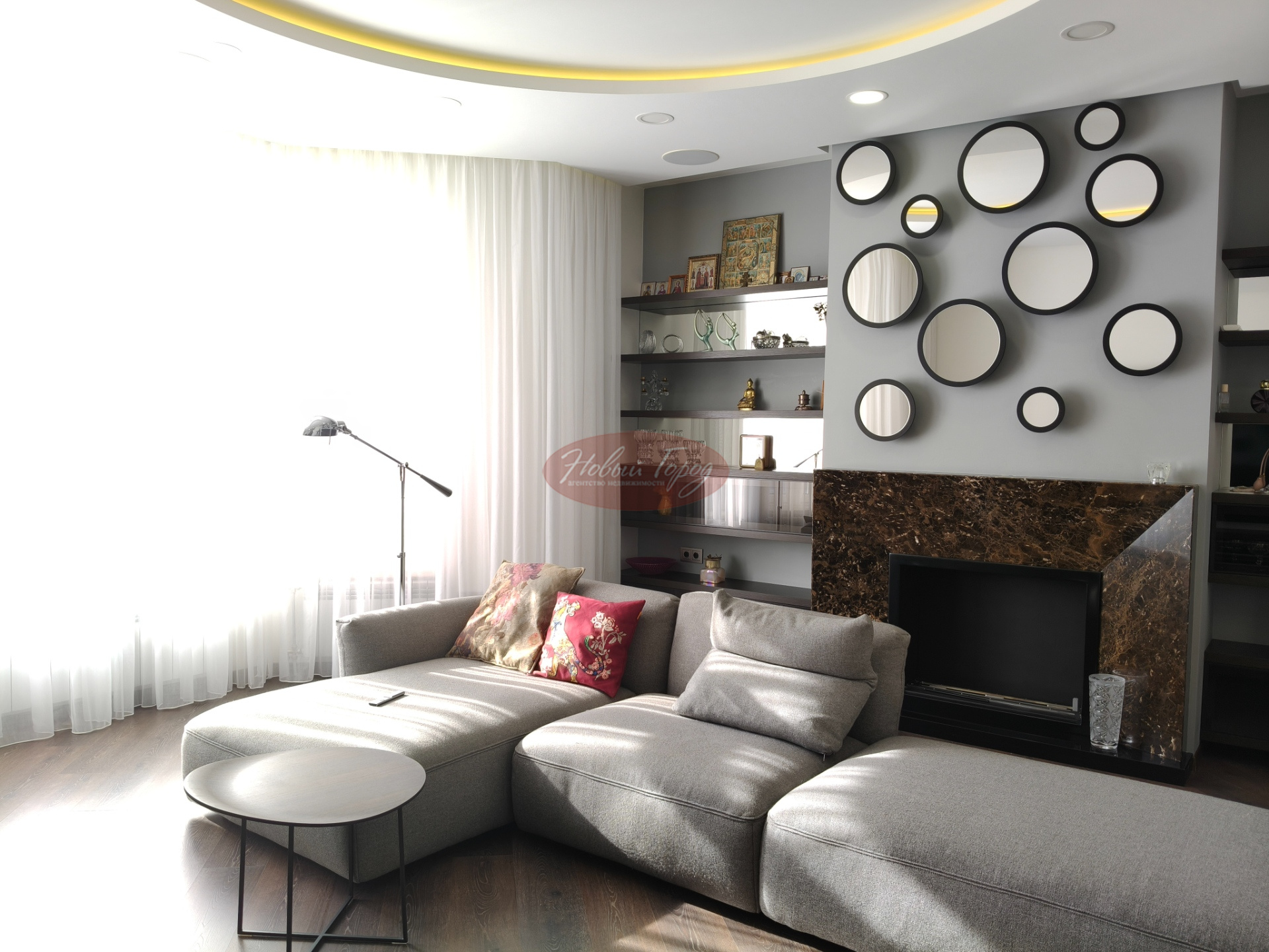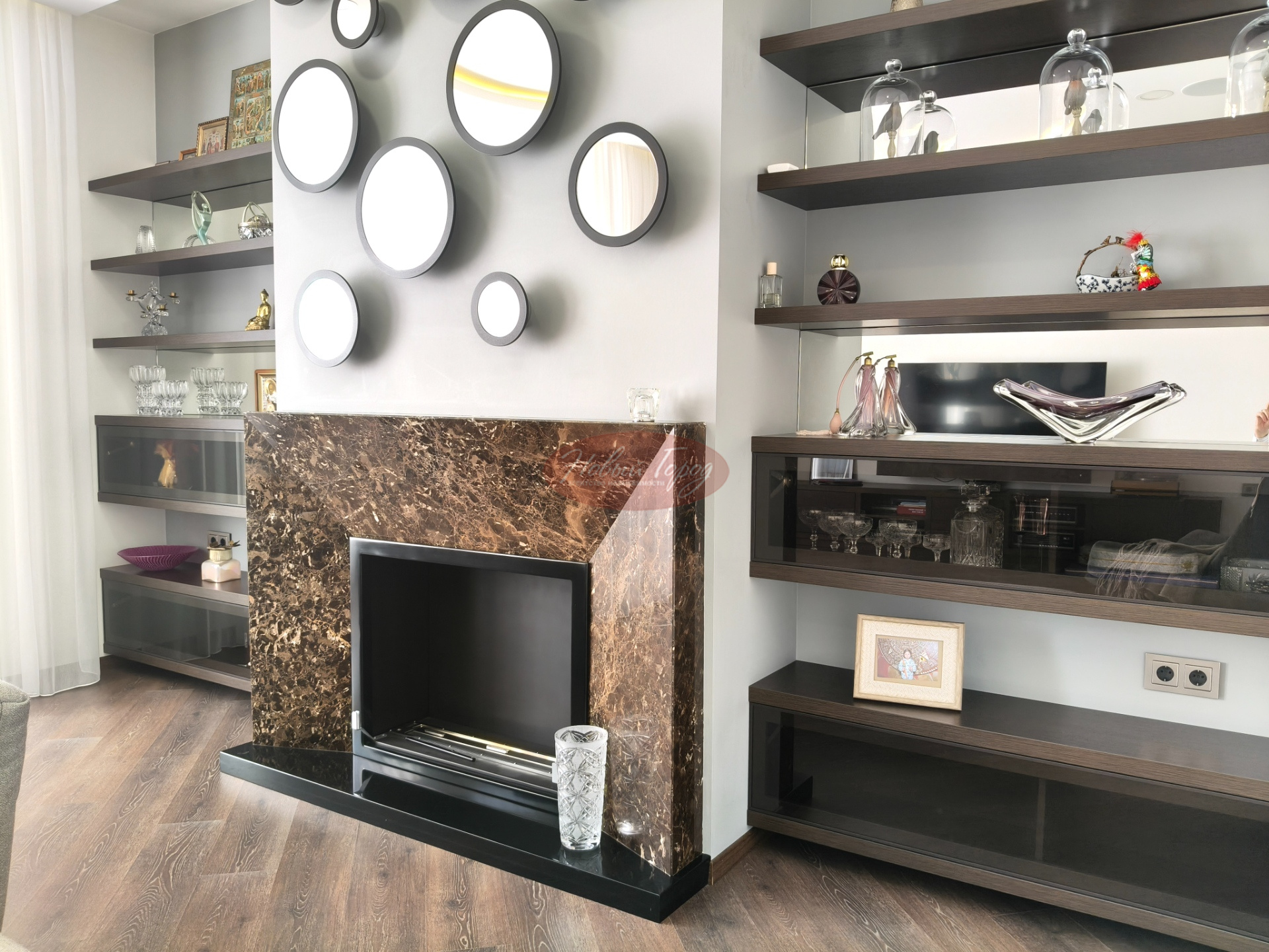 Просторный зал с камином,