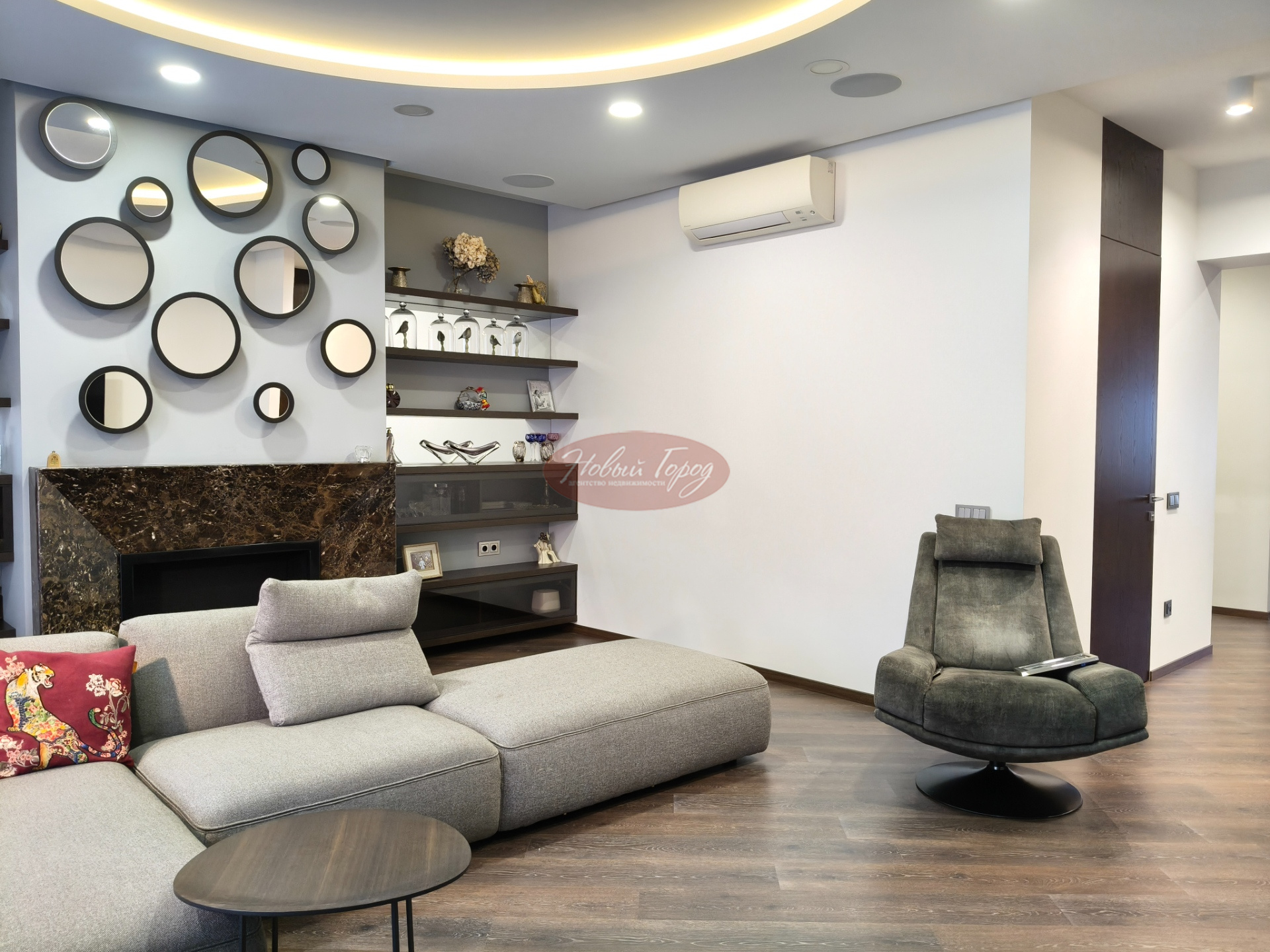 Просторный светлый зал с камином, место отдыха всей семьи.